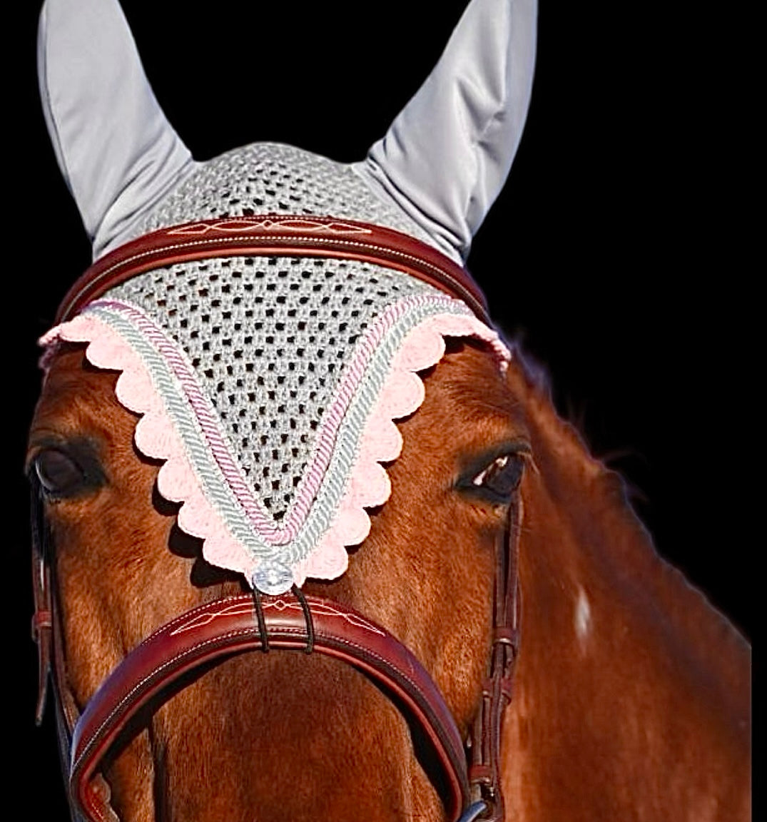 Tiedown Bonnets - Cob - Grey Base/Pink Scallops/3 Clear Bling/Grey and Pink Piping
