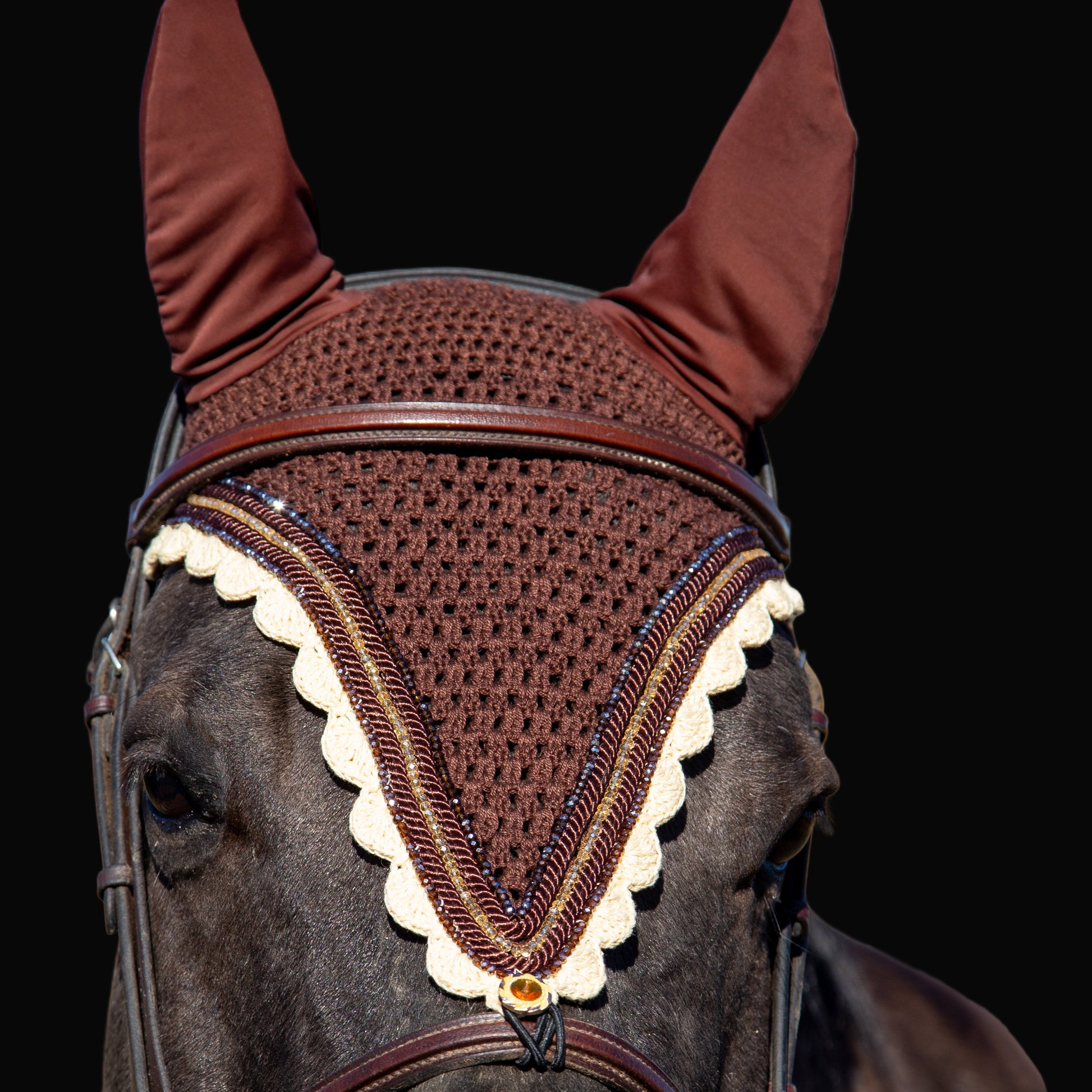 Tiedown Bonnets - Full - Brown Base/Cream Scallops/1 Dark Brown Crystal/1 Gold Crystal/1 Copper Crystal/2 Piping